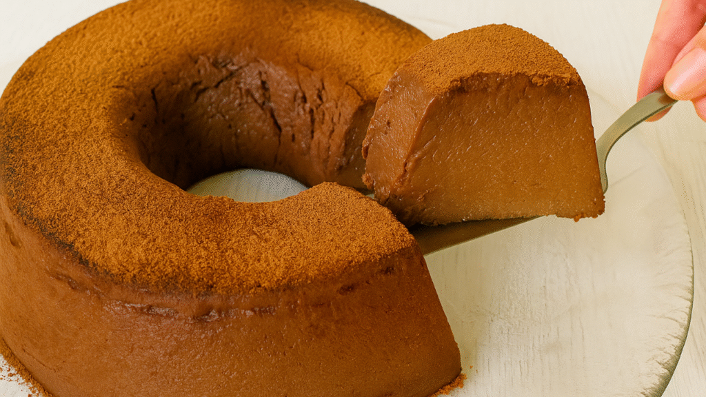 - Desenforme com cuidado e polvilhe chocolate em pó 50% por cima antes de servir.