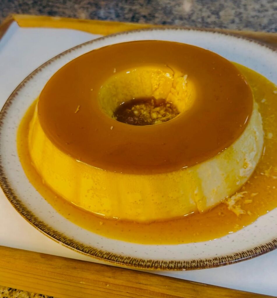 4. Cozimento: coloque água fervente em uma assadeira grande até a metade da forma do pudim e acrescente 1/2 xícara de café de vinagre na assadeira (para não escurecer) leve ao forno em banho-maria (forno preaquecido a 180°C) por aproximadamente 50-60 minutos, ou até que o pudim esteja firme, mas ainda cremoso (250°C).